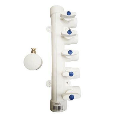 Коллекторы оснащены встроенными отсечными (запорными) шаровыми кранами на отводах. Условный диаметр корпуса – 32, присоединяемых труб – 20 мм. Число выходов – от 2 до 5. В комплект входит ручной воздухоотводчик с полипропиленовым корпусом.